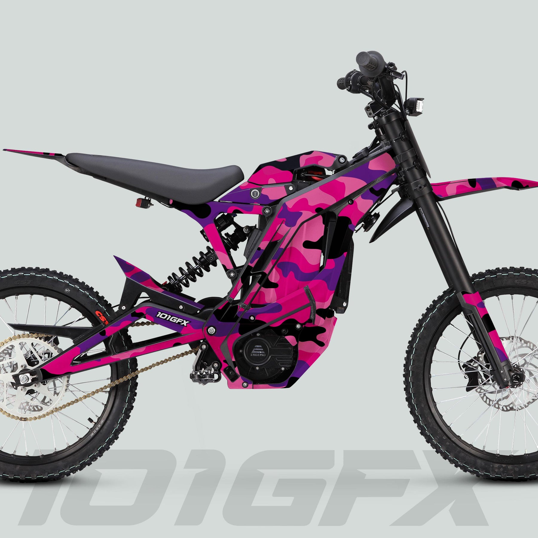 The E Ride Pro SS Graphics Kit CAMOUFLAGE PINKY is the ultimate way to customize your ride, making it stand out with its eye-catching design. This premium graphics kit is tailored for E Ride Pro models, delivering a unique aesthetic that incorporates a stunning camouflage pattern in pink tones. Perfect for enthusiasts looking to enhance their vehicle's appearance, these E Ride Pro decals are a perfect blend of style and functionality.