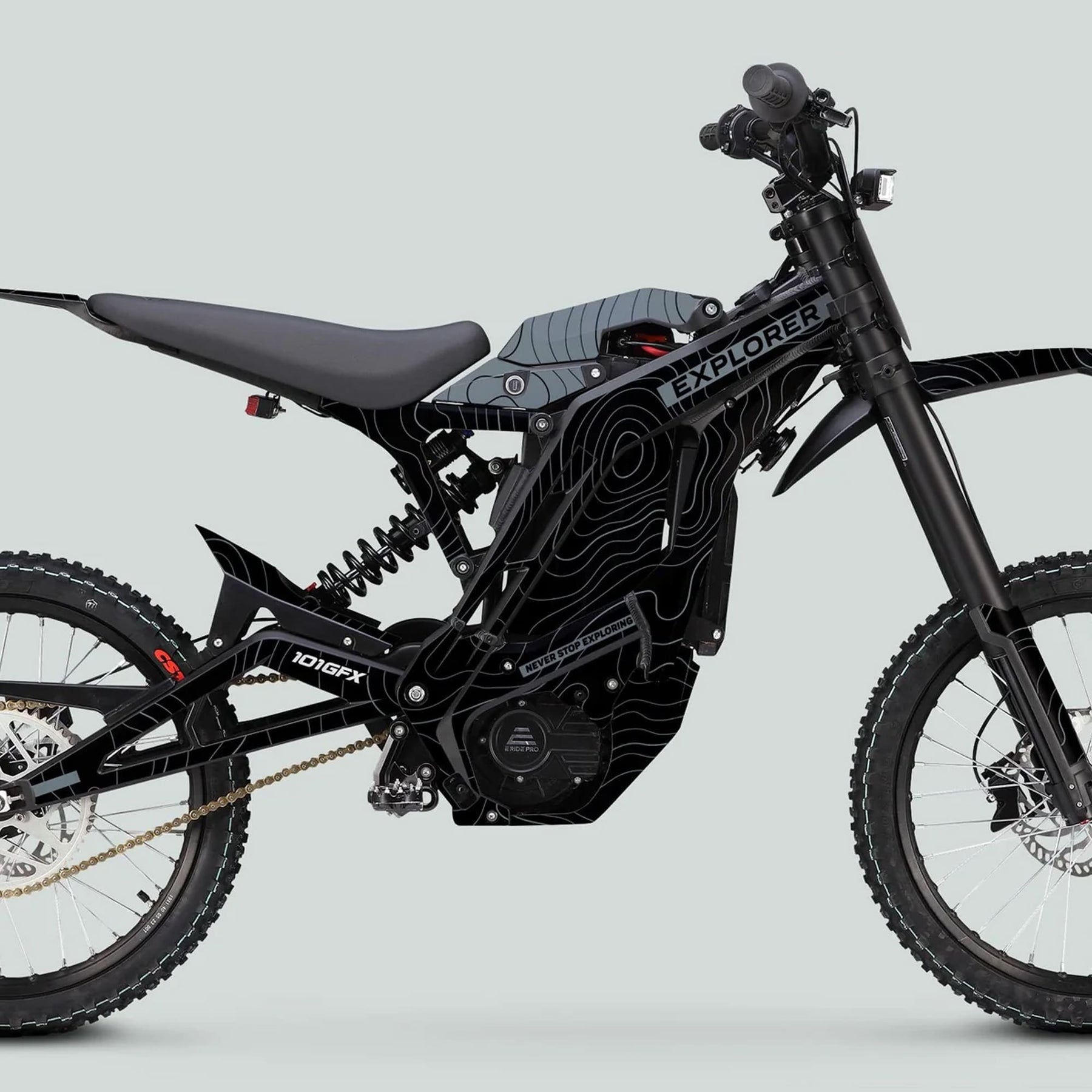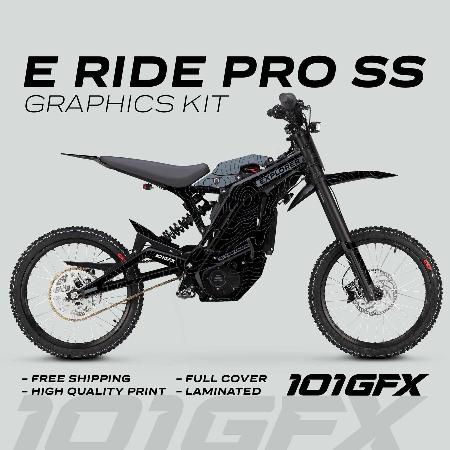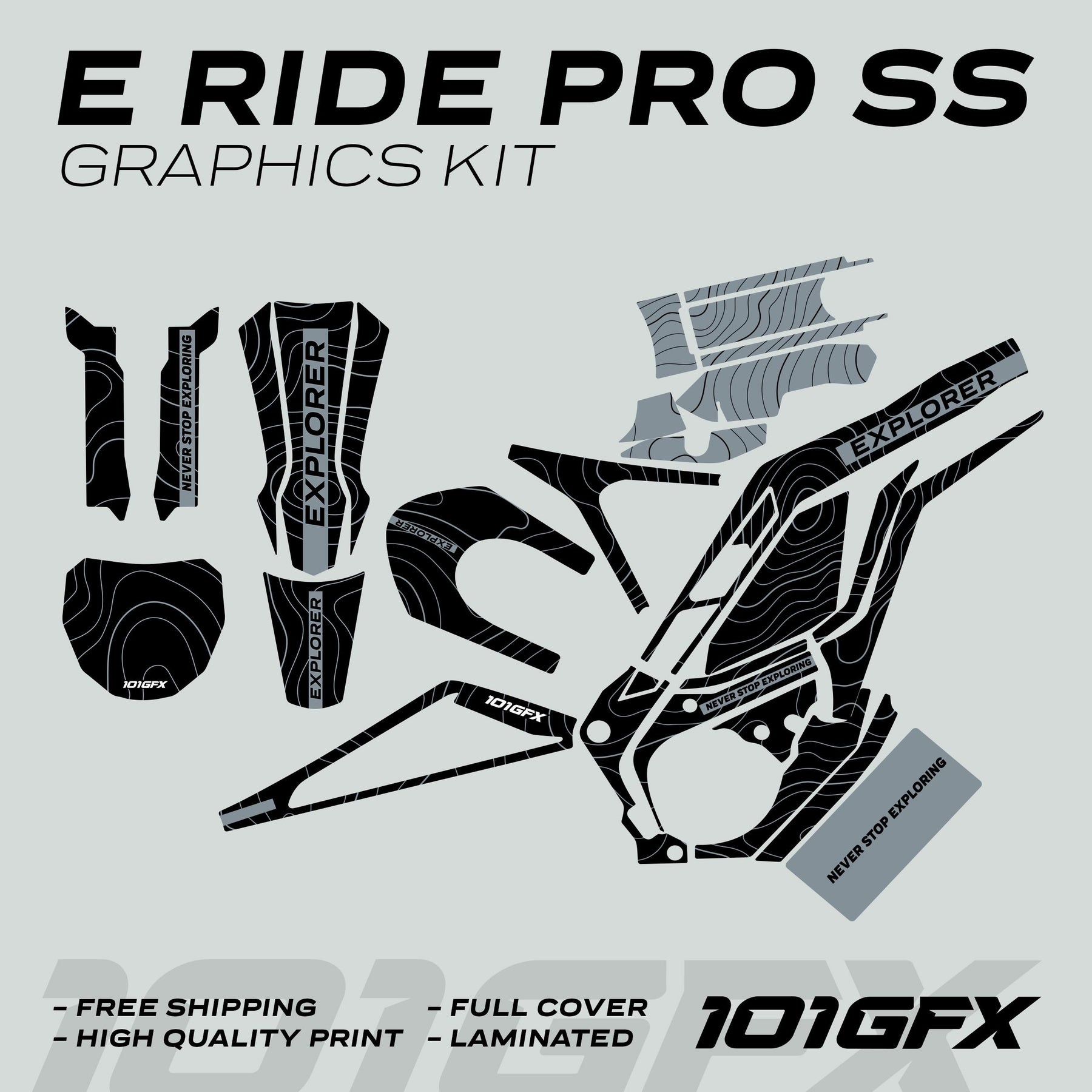 Transform your ride with the E Ride Pro SS Graphics Kit EXPLORER Black Grey. This premium graphics kit is designed specifically for E Ride Pro models, ensuring a perfect fit and stunning aesthetics. The sleek black and grey color scheme enhances your vehicle's appearance, making it stand out wherever you go.