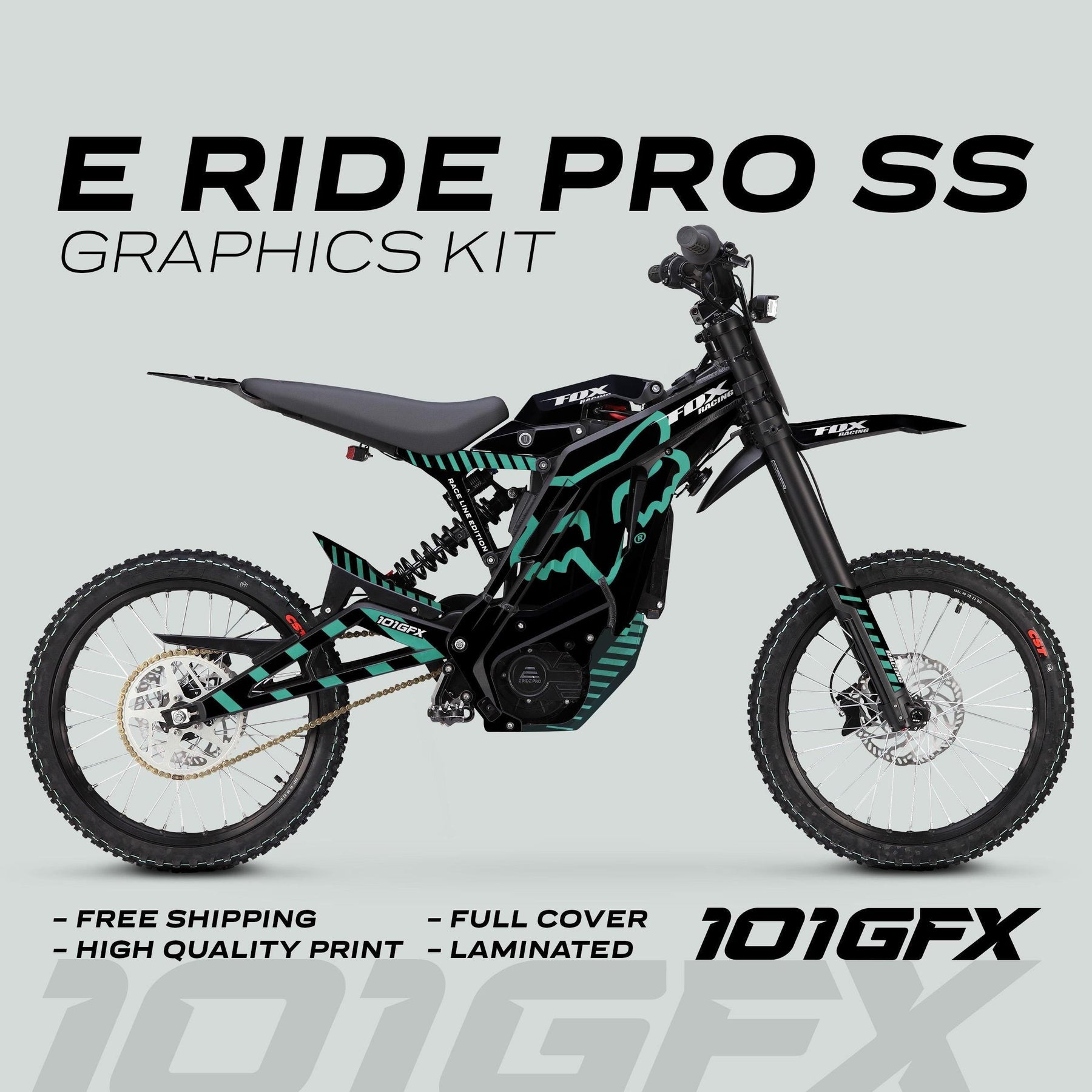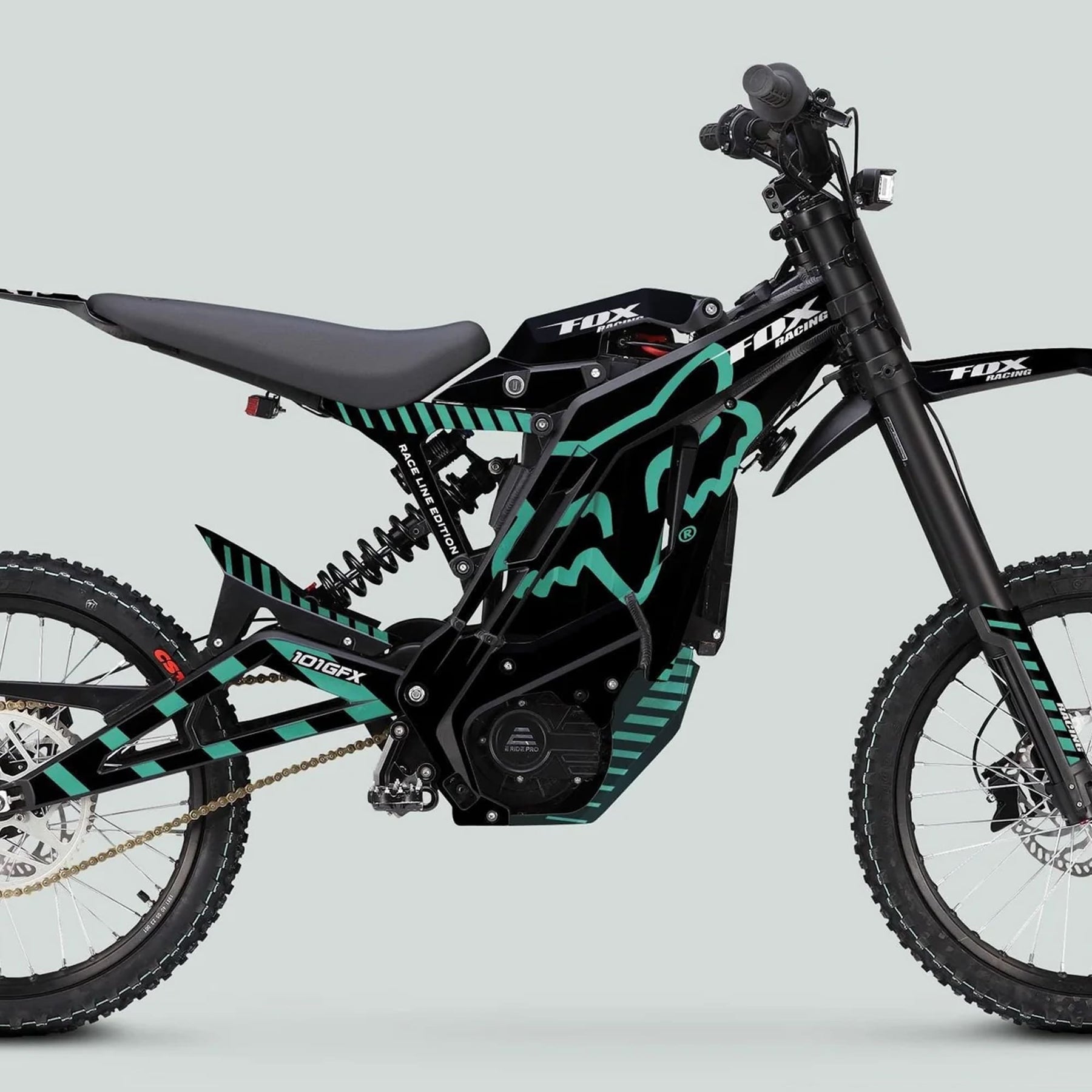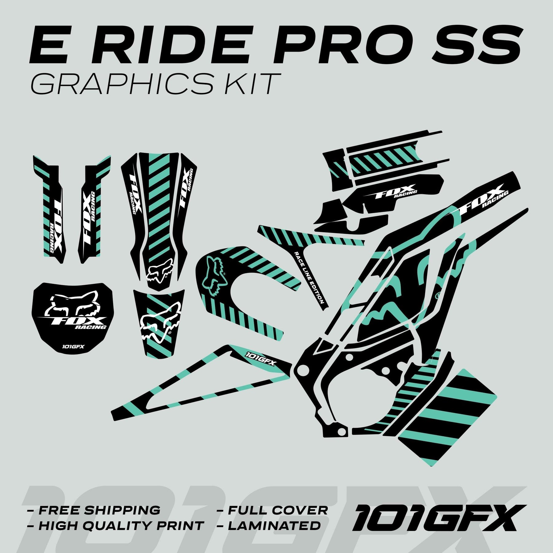 Upgrade your vehicle today with the E Ride Pro SS Graphics Kit FOX Race Line Black Mint and make every ride unforgettable!