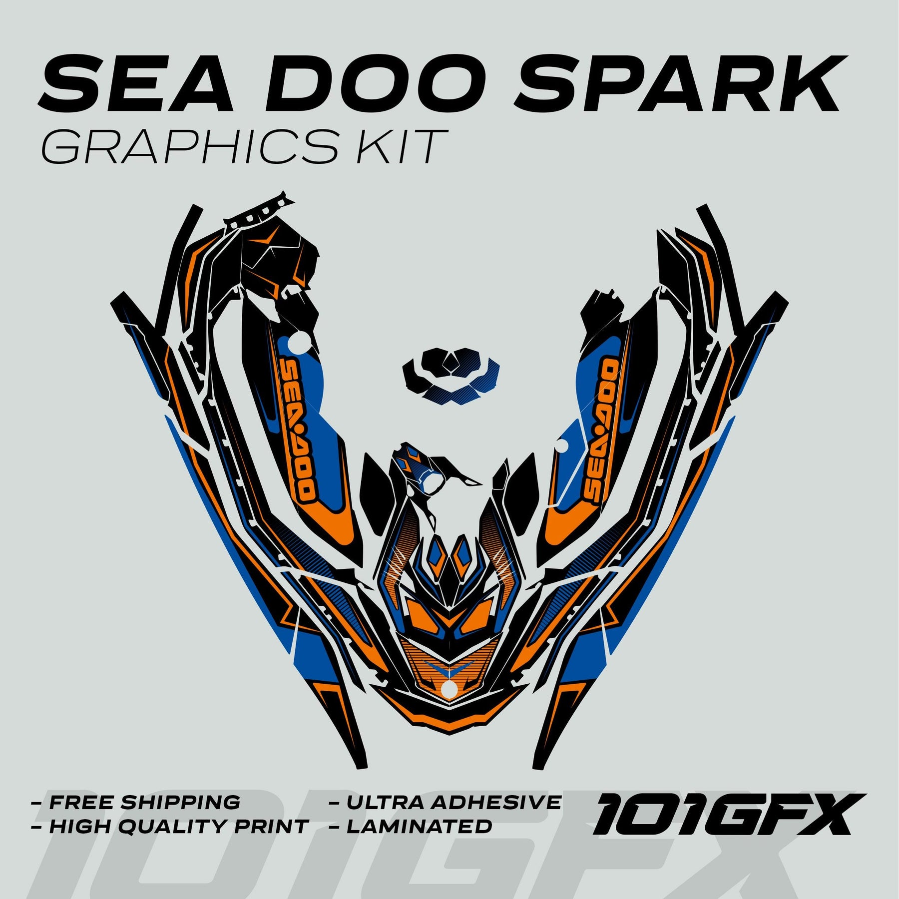 Sea Doo Spark Graphics Kit RACE LINE Blue Orange on black jet ski, featuring vibrant orange and blue decals, highlighted with promotional benefits and 101GFX branding.