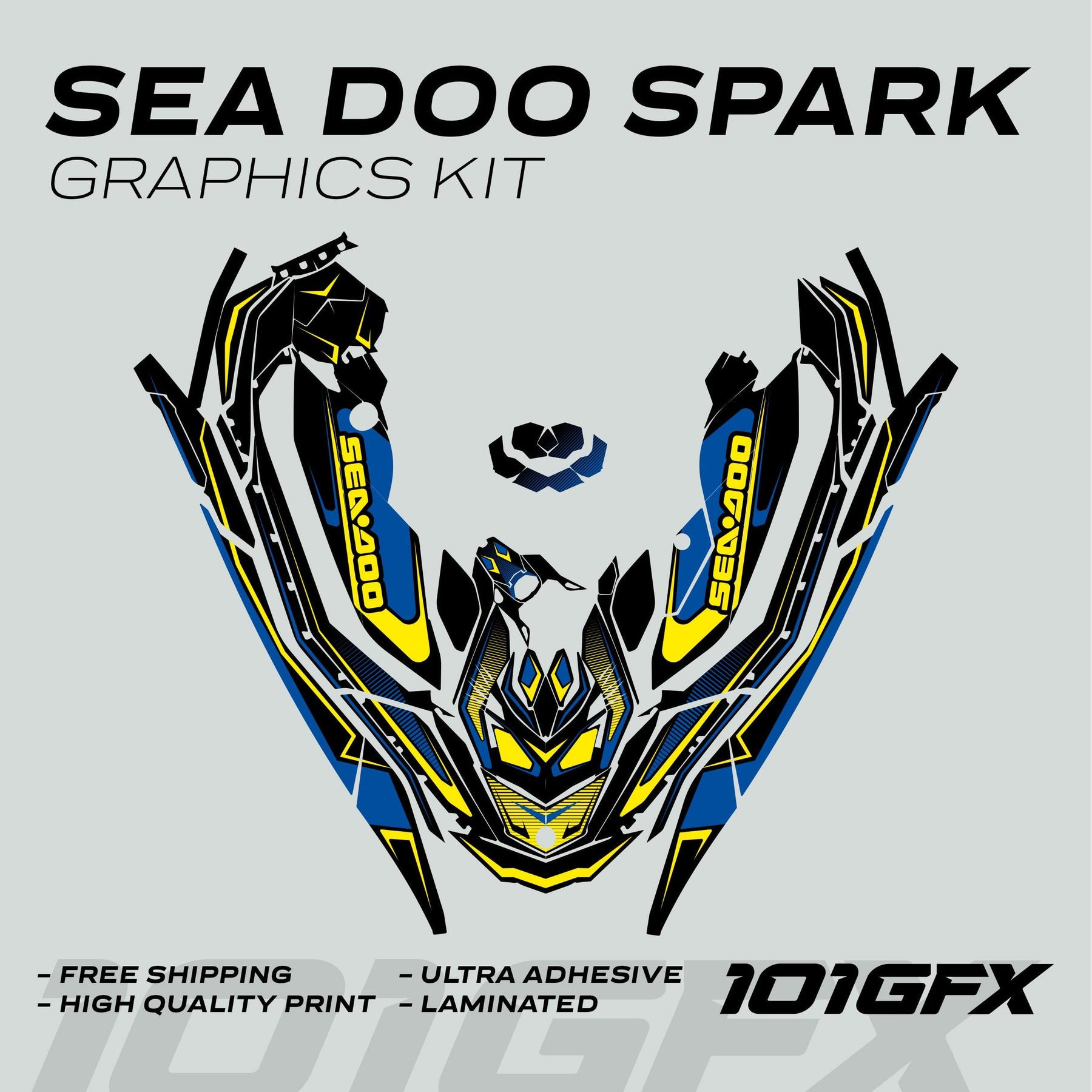 Sea Doo Spark Graphics Kit RACE LINE Cyan Yellow on watercraft, featuring blue, black, yellow design with text: free shipping, high quality print, ultra adhesive, laminated, by 101GFX.