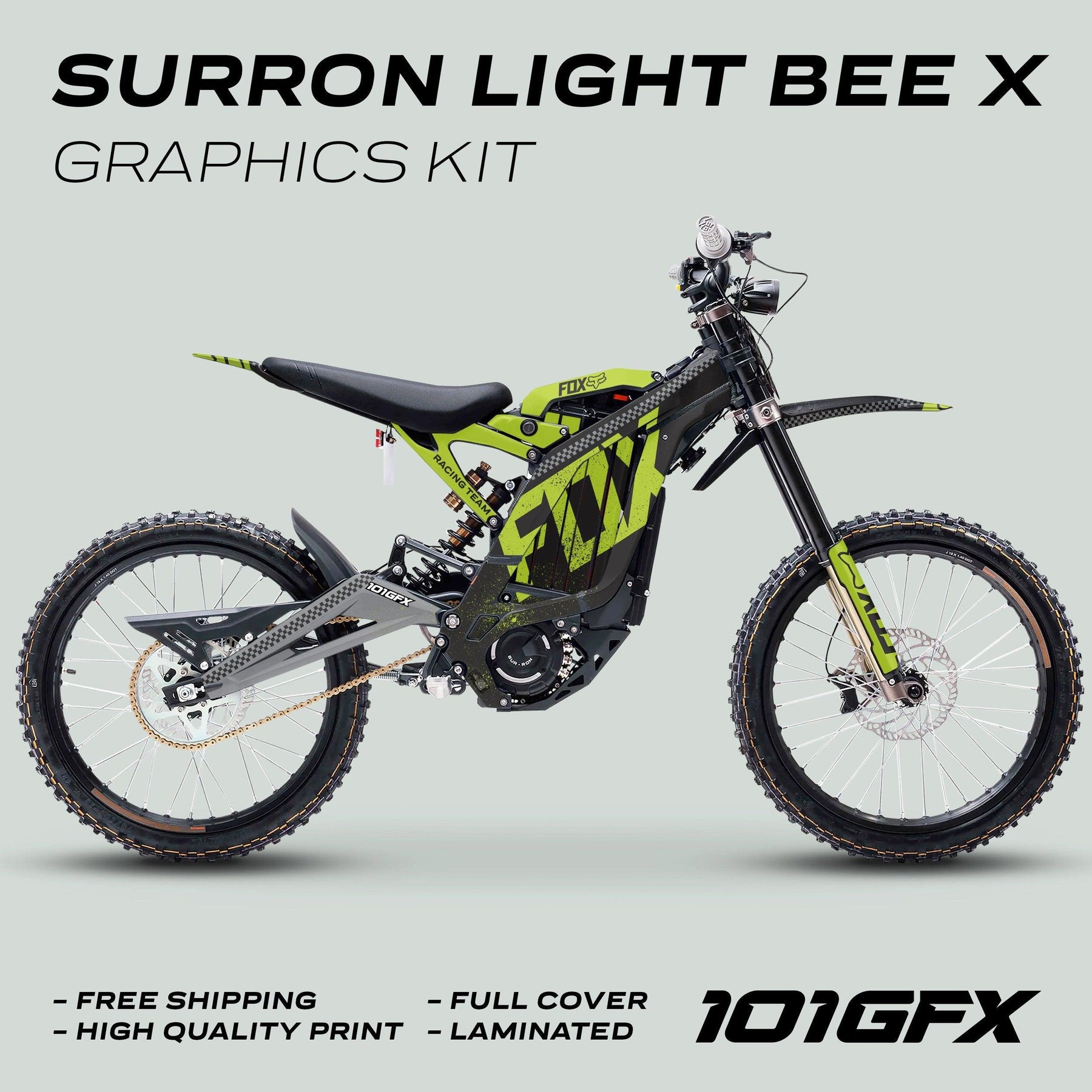 Transform your ride with the Surron Light Bee X Graphics Kit FOX DUST Black Green. Designed specifically for the Surron Light Bee X, this bike graphics kit seamlessly combines style and durability. Elevate your bike's aesthetic with our unique decals that are perfect for making a statement on any trail.