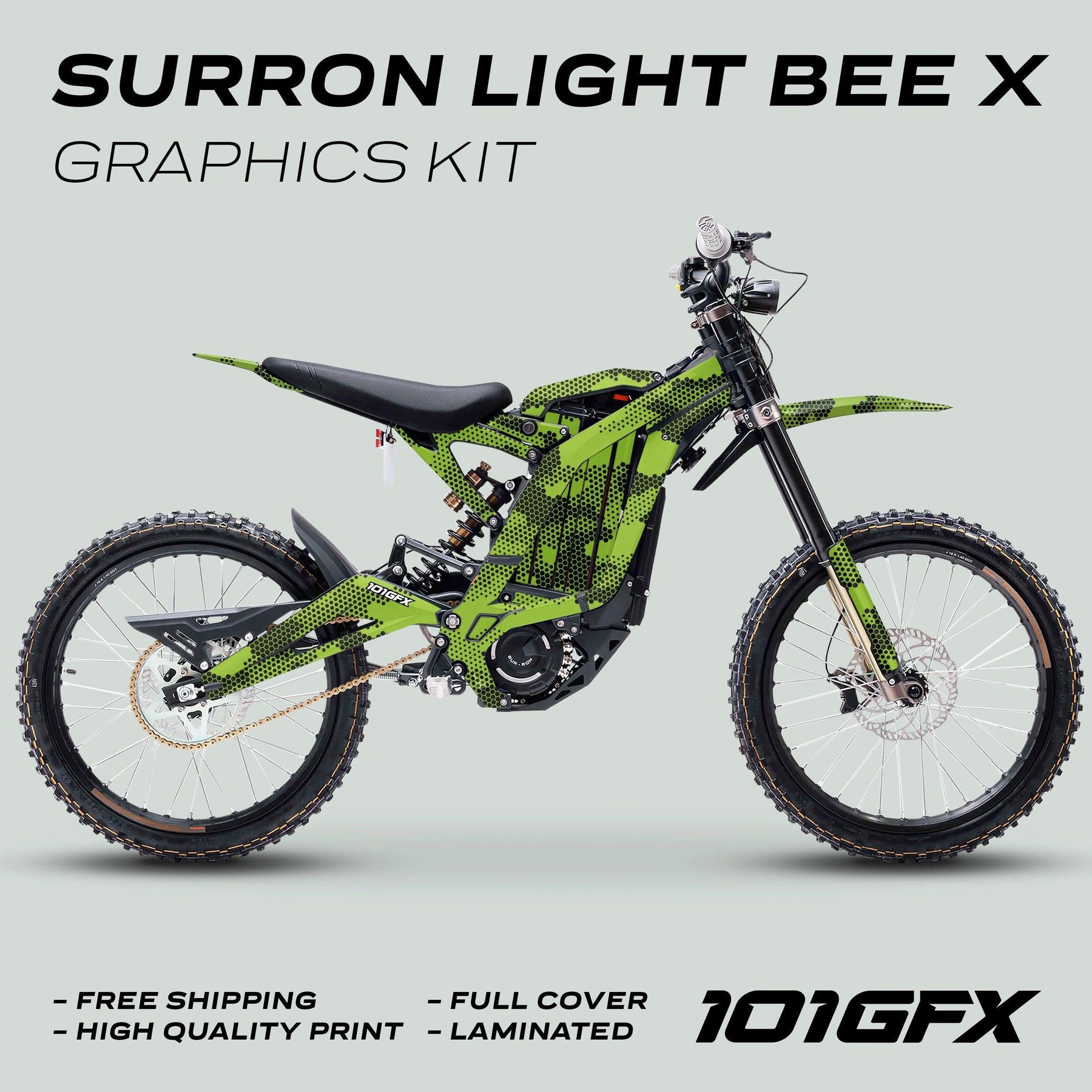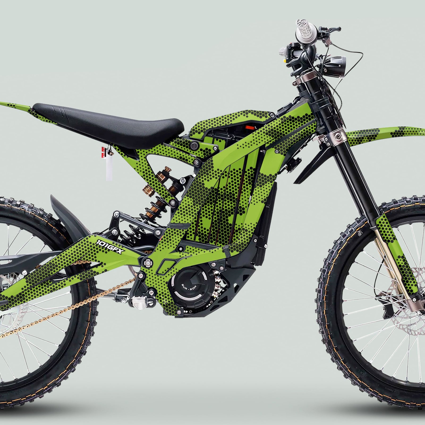 Surron Light Bee X Graphics Kit HEXOCAM Green, die-cut vinyl decals in hex-dot camo pattern, full-coverage, laminated, high-quality print, by 101GFX.
