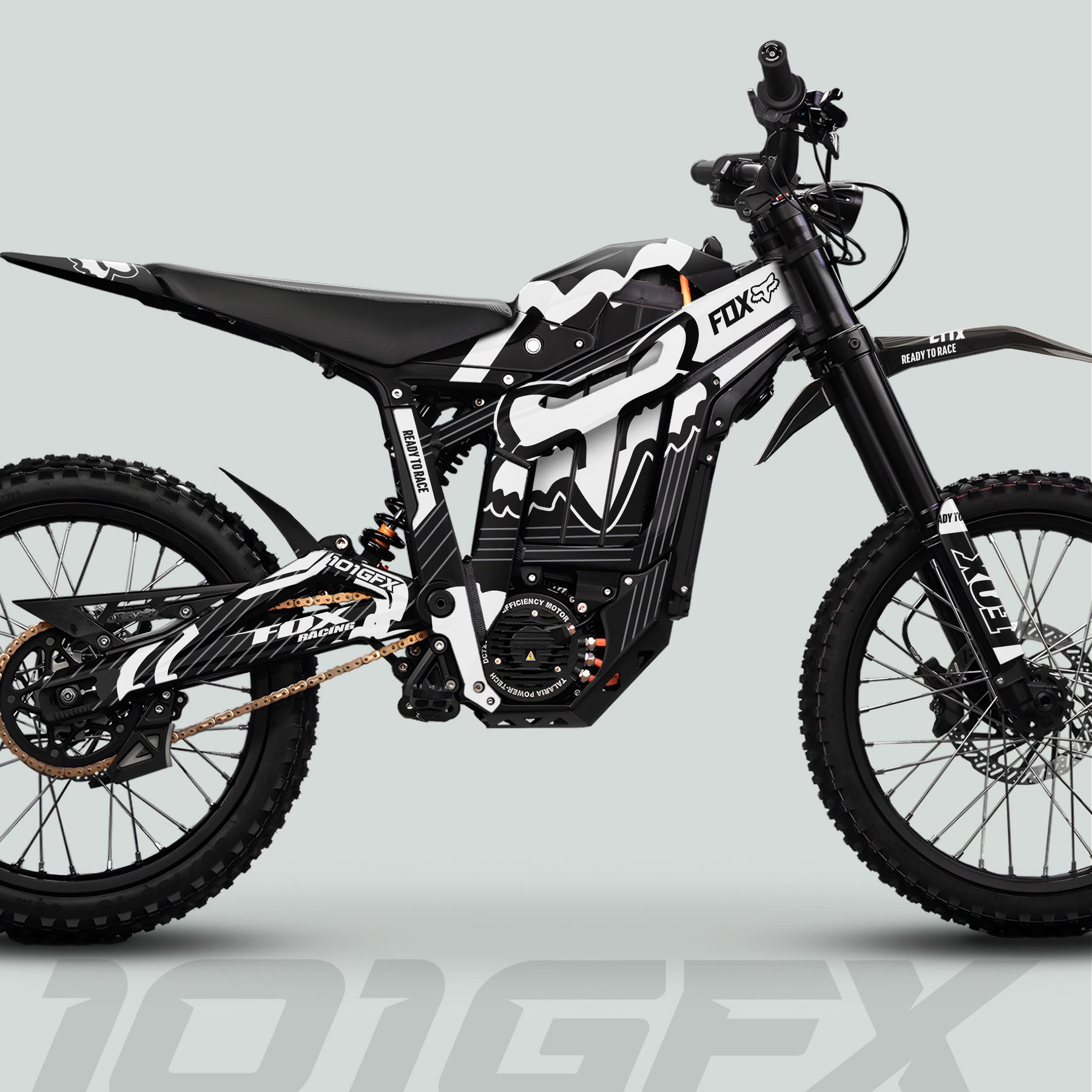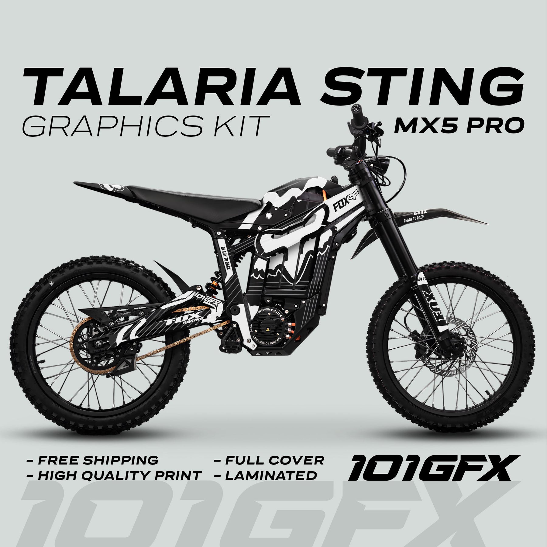 Talaria Sting MX5 PRO Graphics Kit with FOX STRIPES, featuring black-and-white design, knobby tires, chain drive, and disc brakes; highlights include full coverage and easy installation.
