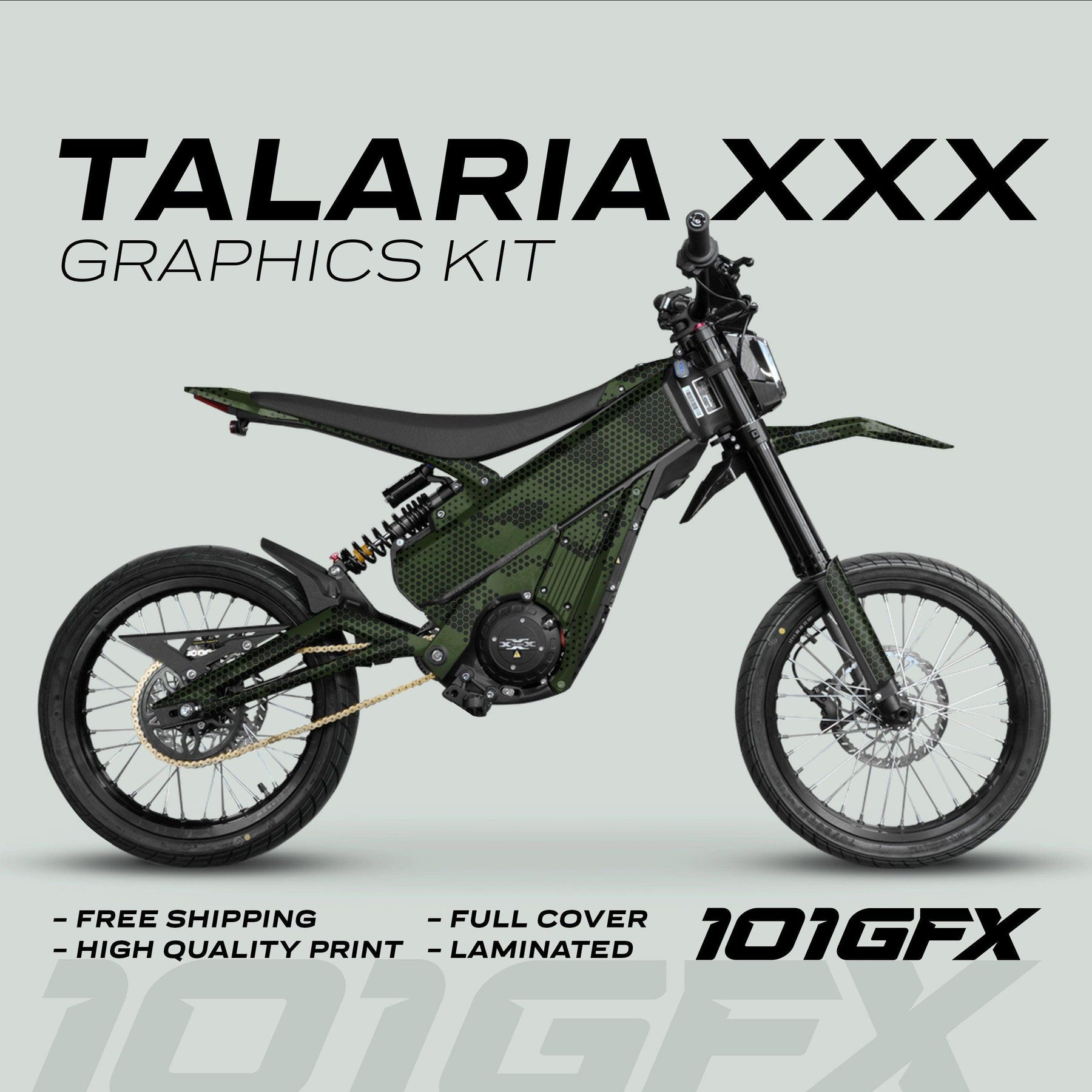 Transform your Talaria XXX with our unique HEXOCAM Green Graphics Kit, designed to elevate your ride while providing essential protection and style. This premium kit features full coverage, ensuring your vehicle not only looks stunning but stays safeguarded against scratches and wear. Tailored specifically for the Talaria series, these Talaria decals are a perfect fit, enhancing the aesthetic appeal of your vehicle.